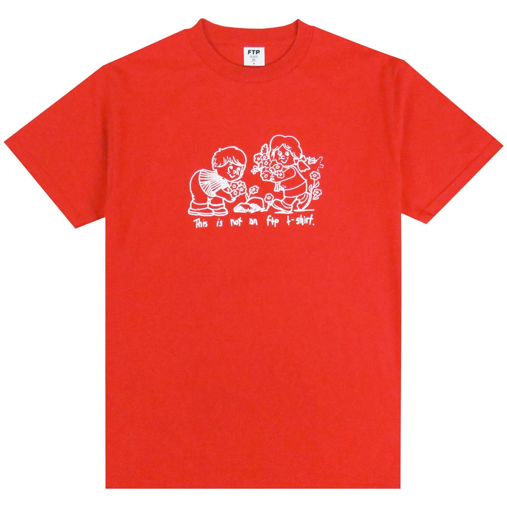 Show some pastoral love for FTP in this SS20 100% cotton tee featuring a lovely screen printed graphic on front consisting of a young girl + boy picking flowers with the tagline 'this is not an ftp t-shirt'.