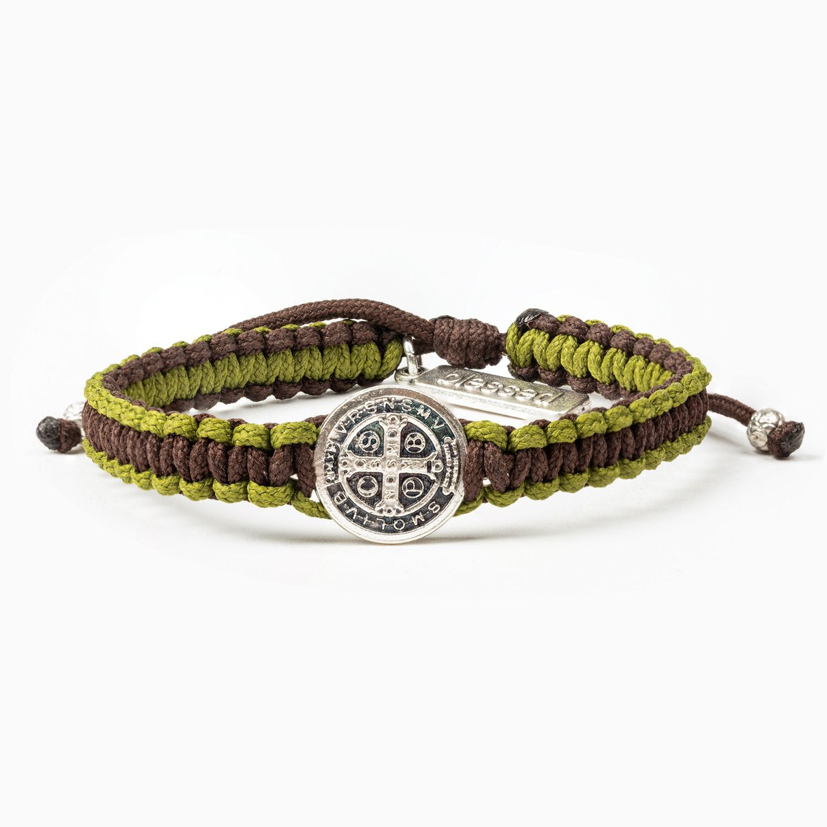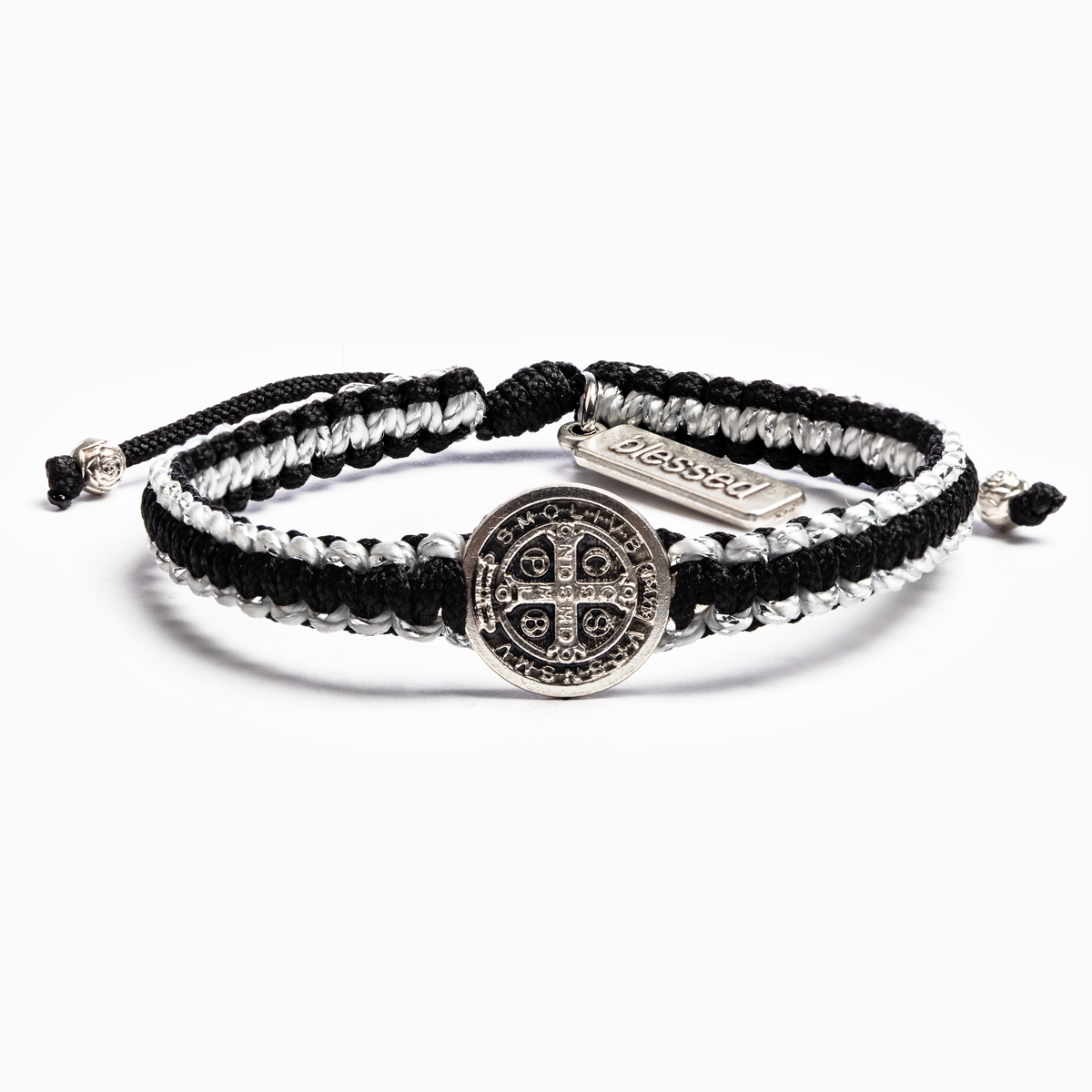 - Silver or gold-tone .5" Benedictine medal on woven cord and silver or gold-tone "blessed" tag